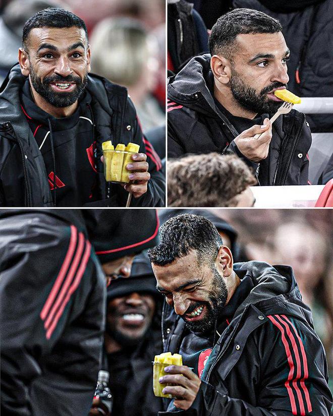 萨拉赫被现场摄影师拍到在替补席吃菠萝块,并且开怀大笑,在外网社媒引发了巨大争议。